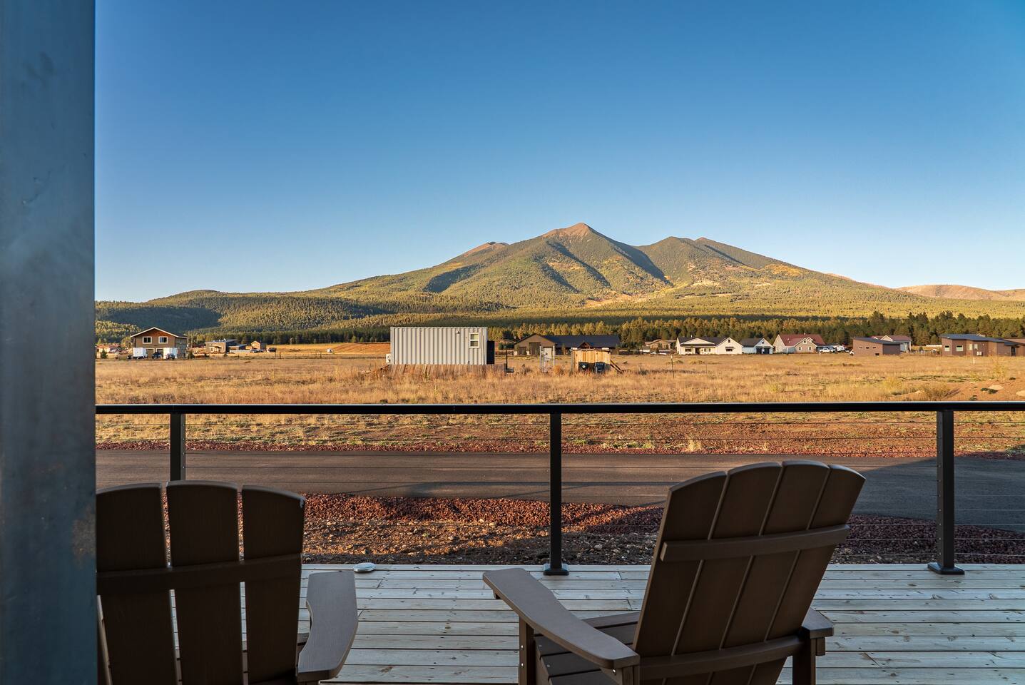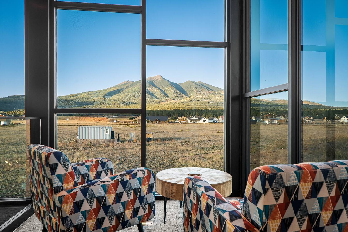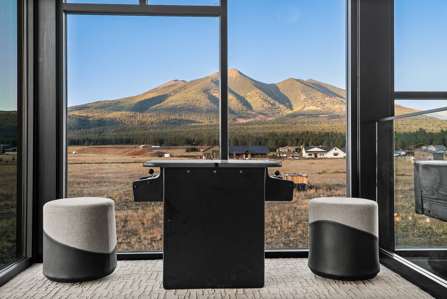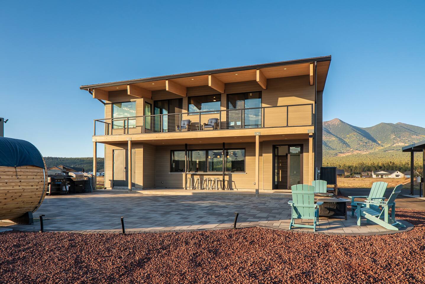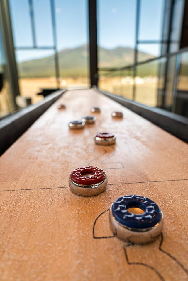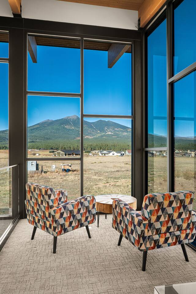 Experience an amazing mountain getaway at this modern mountain home, where towering 30-foot windows and glass railings bring the spectacular Flagstaff scenery indoors. The open and bright main level is designed for making memories and enjoying your time together. Relax and recharge at our modern 3-bedroom mountain retreat, where panoramic San Francisco Peak views are framed by towering 30-foot windows. This bright, open-concept home is designed for making memories, with a whole-home sound system providing the perfect soundtrack for your getaway. LIVING & ENTERTAINMENT Open-concept living area with a large sectional sofa. 85" smart TV for movie nights. Classic video arcade and shuffleboard table for friendly competition. Fully equipped kitchen with a large island and a sliding window that opens to an outdoor bar. OUTDOOR OASIS Private 2-acre property. Relaxing barrel sauna. Cozy fire pit for evening stories. Outdoor games including cornhole, frisbee golf and basketball hoop. Converted Connex box lounge with its own bar and sound system. Expansive starlit decks for unforgettable evenings. BEDROOMS & BATHROOMS Upstairs Primary Suite: King bed, ensuite bathroom, TV, and a private 40-foot deck with swivel rocking chairs. Downstairs Guest Bedroom: Comfortable queen bed and closet space. Downstairs Bunk Room: Twin-over-full bunk bed with a twin trundle, TV, and a full-length mirror. FAMILY-FRIENDLY AMENITIES Pack ’n play/travel crib High chair Children's books and toys WORK FROM HERE Dedicated workspace and fast Wi-Fi make this home ideal for remote work or longer stays. **Sorry - we love our furry pets, but they are not allowed ** All space accessible by guests with exception to 2 locked owner closet/ storage spaces. TPT 21573458 STR 25-0647