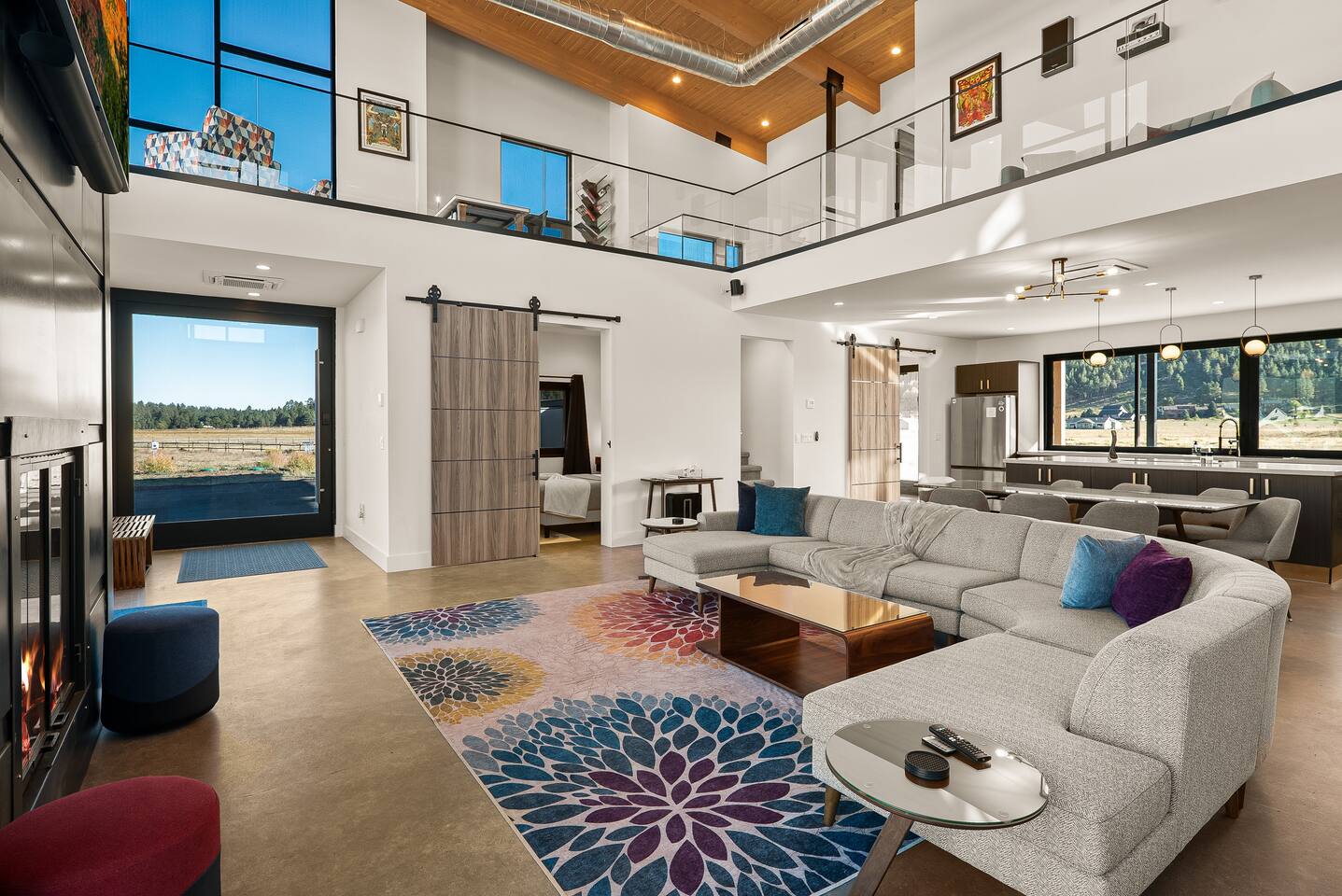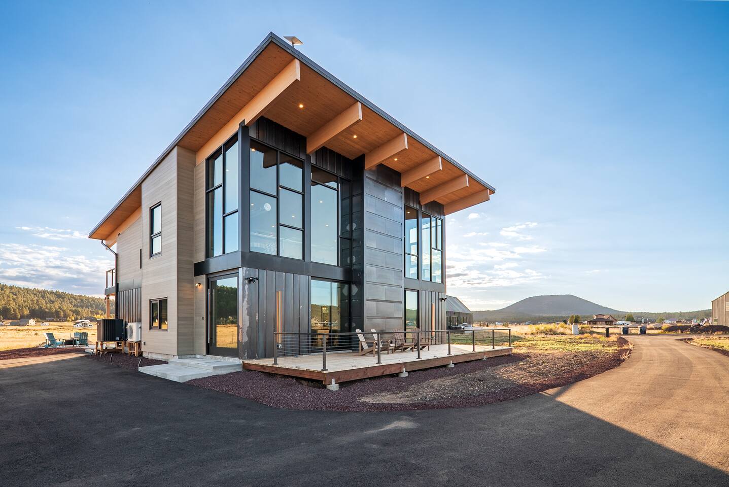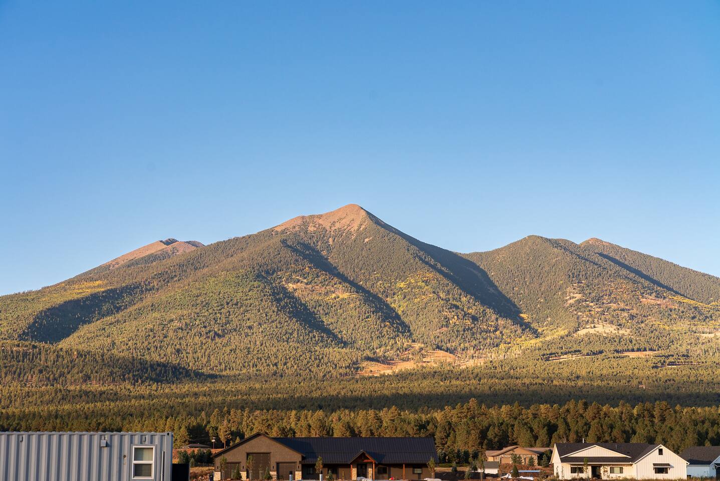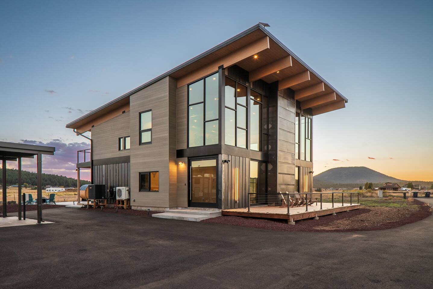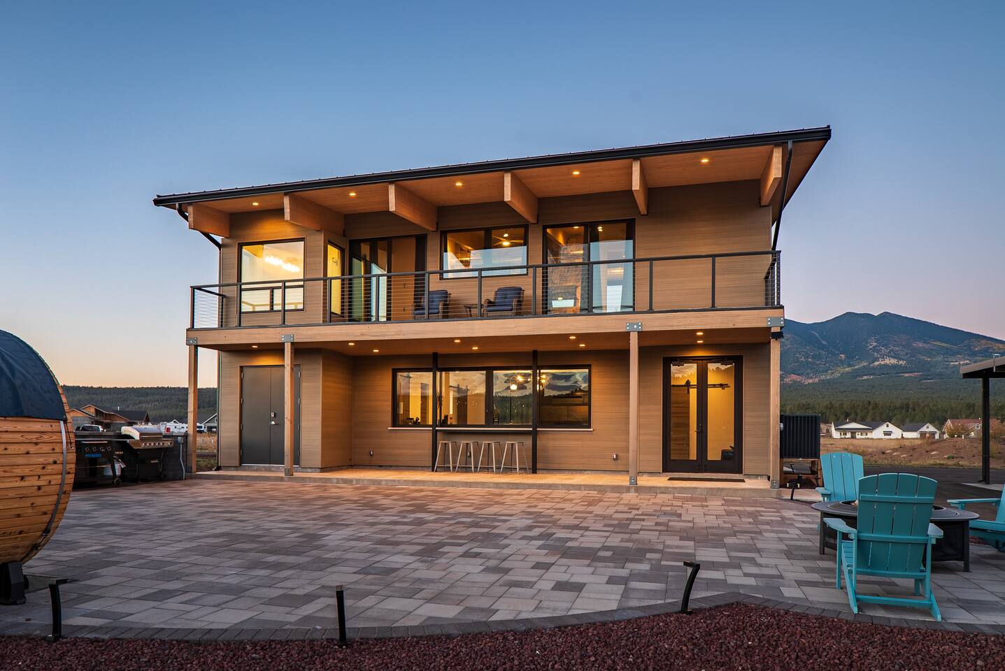 Experience an amazing mountain getaway at this modern mountain home, where towering 30-foot windows and glass railings bring the spectacular Flagstaff scenery indoors. The open and bright main level is designed for making memories and enjoying your time together. Relax and recharge at our modern 3-bedroom mountain retreat, where panoramic San Francisco Peak views are framed by towering 30-foot windows. This bright, open-concept home is designed for making memories, with a whole-home sound system providing the perfect soundtrack for your getaway. LIVING & ENTERTAINMENT Open-concept living area with a large sectional sofa. 85" smart TV for movie nights. Classic video arcade and shuffleboard table for friendly competition. Fully equipped kitchen with a large island and a sliding window that opens to an outdoor bar. OUTDOOR OASIS Private 2-acre property. Relaxing barrel sauna. Cozy fire pit for evening stories. Outdoor games including cornhole, frisbee golf and basketball hoop. Converted Connex box lounge with its own bar and sound system. Expansive starlit decks for unforgettable evenings. BEDROOMS & BATHROOMS Upstairs Primary Suite: King bed, ensuite bathroom, TV, and a private 40-foot deck with swivel rocking chairs. Downstairs Guest Bedroom: Comfortable queen bed and closet space. Downstairs Bunk Room: Twin-over-full bunk bed with a twin trundle, TV, and a full-length mirror. FAMILY-FRIENDLY AMENITIES Pack ’n play/travel crib High chair Children's books and toys WORK FROM HERE Dedicated workspace and fast Wi-Fi make this home ideal for remote work or longer stays. **Sorry - we love our furry pets, but they are not allowed ** All space accessible by guests with exception to 2 locked owner closet/ storage spaces. TPT 21573458 STR 25-0647