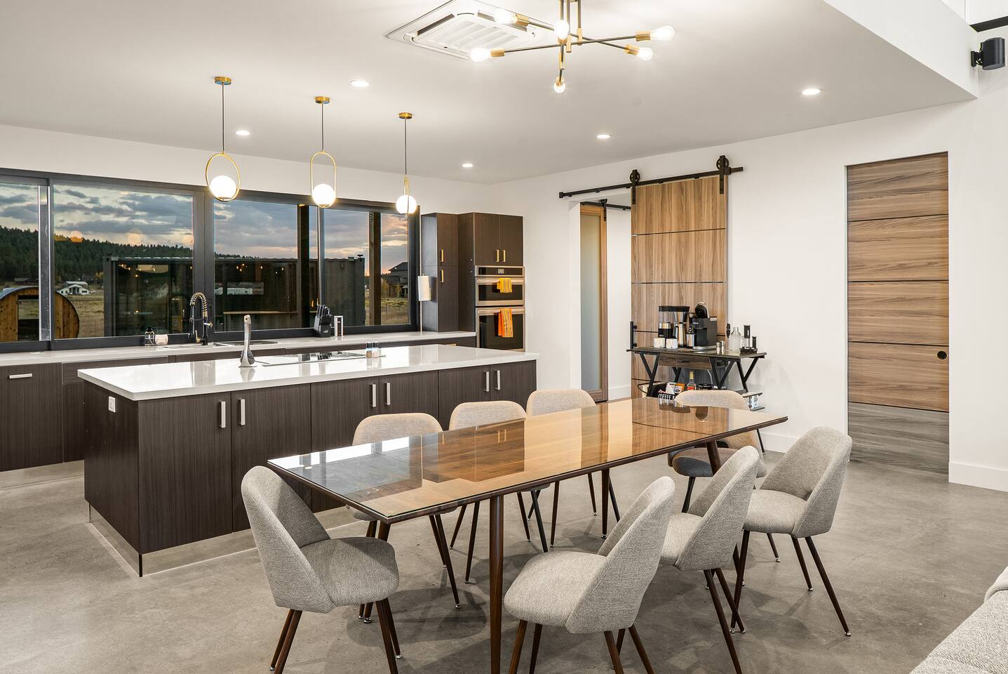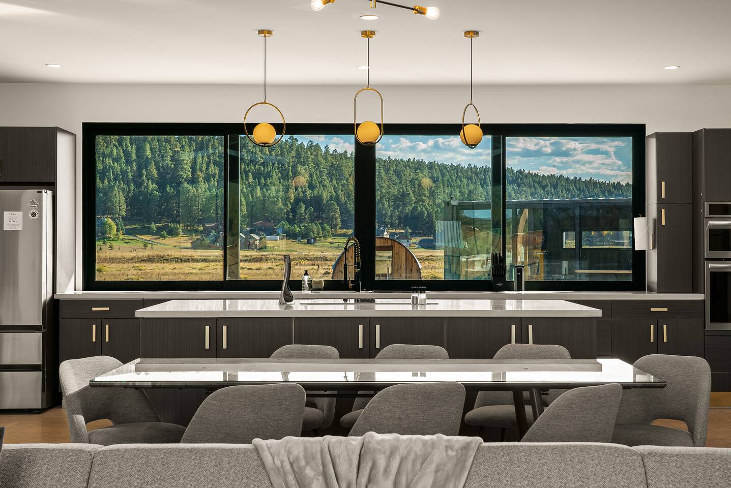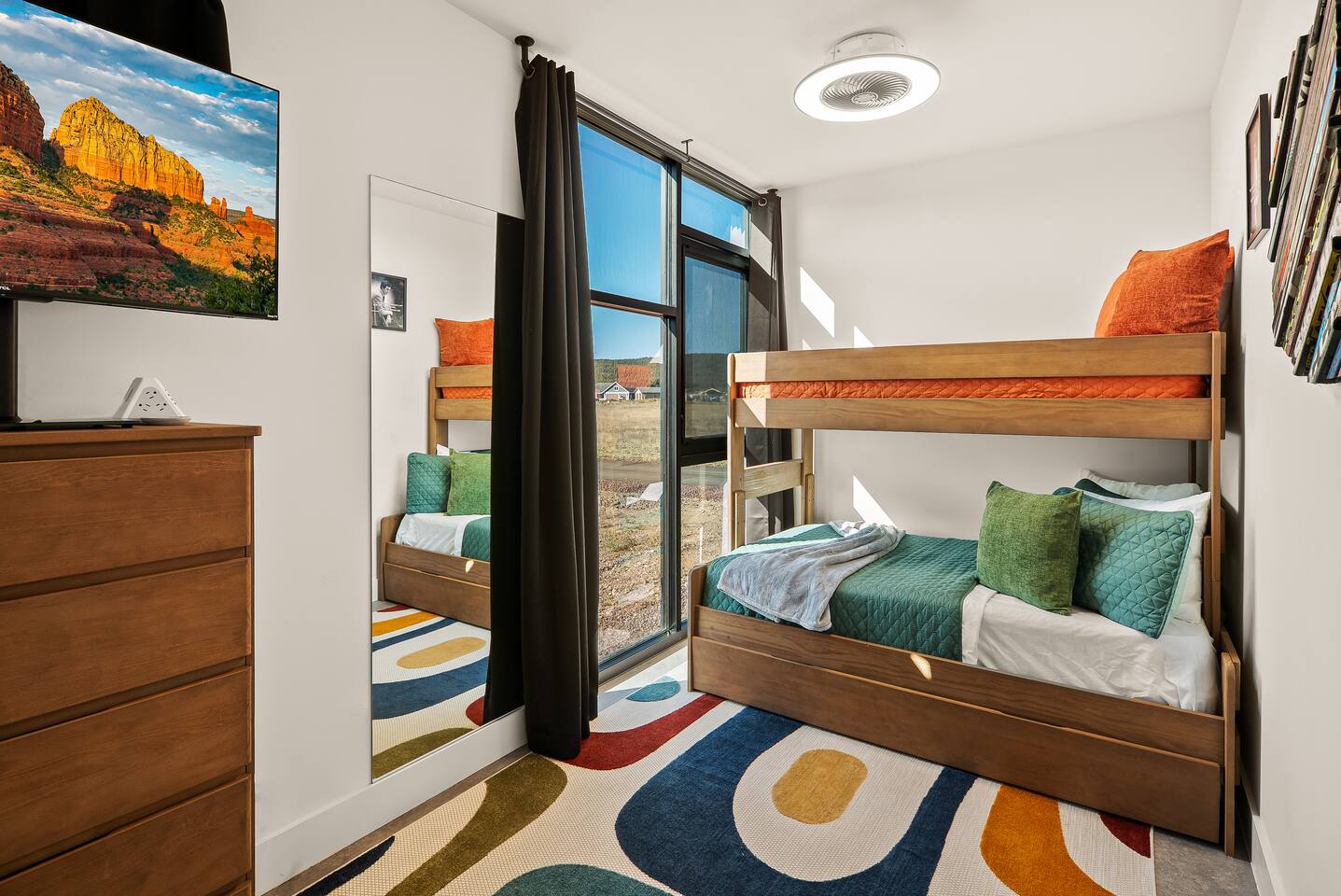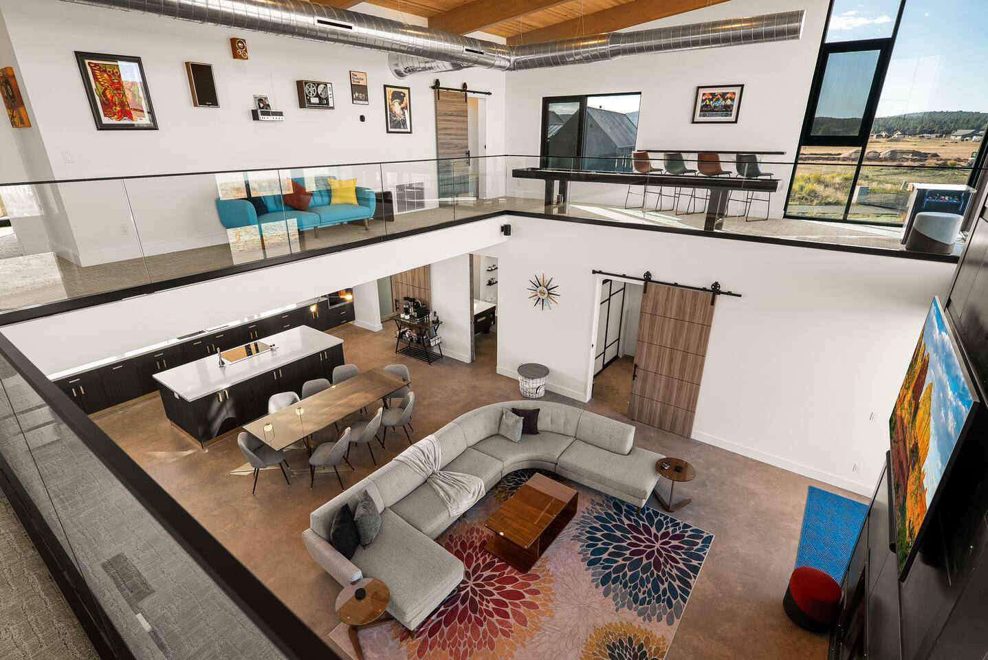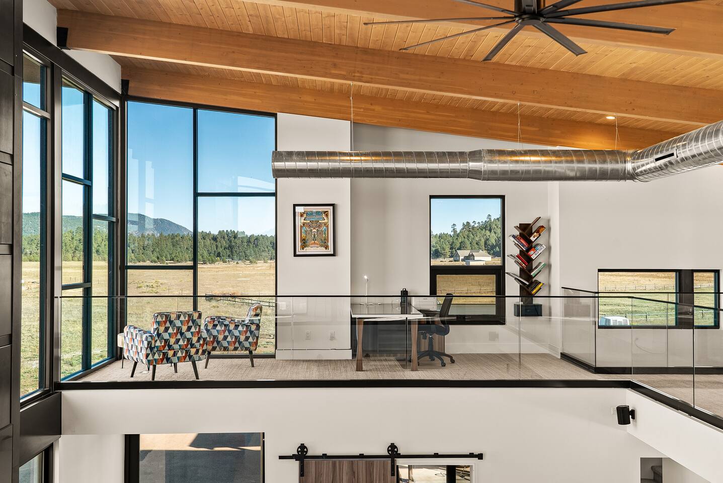 Experience an amazing mountain getaway at this modern mountain home, where towering 30-foot windows and glass railings bring the spectacular Flagstaff scenery indoors. The open and bright main level is designed for making memories and enjoying your time together. Relax and recharge at our modern 3-bedroom mountain retreat, where panoramic San Francisco Peak views are framed by towering 30-foot windows. This bright, open-concept home is designed for making memories, with a whole-home sound system providing the perfect soundtrack for your getaway. LIVING & ENTERTAINMENT Open-concept living area with a large sectional sofa. 85" smart TV for movie nights. Classic video arcade and shuffleboard table for friendly competition. Fully equipped kitchen with a large island and a sliding window that opens to an outdoor bar. OUTDOOR OASIS Private 2-acre property. Relaxing barrel sauna. Cozy fire pit for evening stories. Outdoor games including cornhole, frisbee golf and basketball hoop. Converted Connex box lounge with its own bar and sound system. Expansive starlit decks for unforgettable evenings. BEDROOMS & BATHROOMS Upstairs Primary Suite: King bed, ensuite bathroom, TV, and a private 40-foot deck with swivel rocking chairs. Downstairs Guest Bedroom: Comfortable queen bed and closet space. Downstairs Bunk Room: Twin-over-full bunk bed with a twin trundle, TV, and a full-length mirror. FAMILY-FRIENDLY AMENITIES Pack ’n play/travel crib High chair Children's books and toys WORK FROM HERE Dedicated workspace and fast Wi-Fi make this home ideal for remote work or longer stays. **Sorry - we love our furry pets, but they are not allowed ** All space accessible by guests with exception to 2 locked owner closet/ storage spaces. TPT 21573458 STR 25-0647