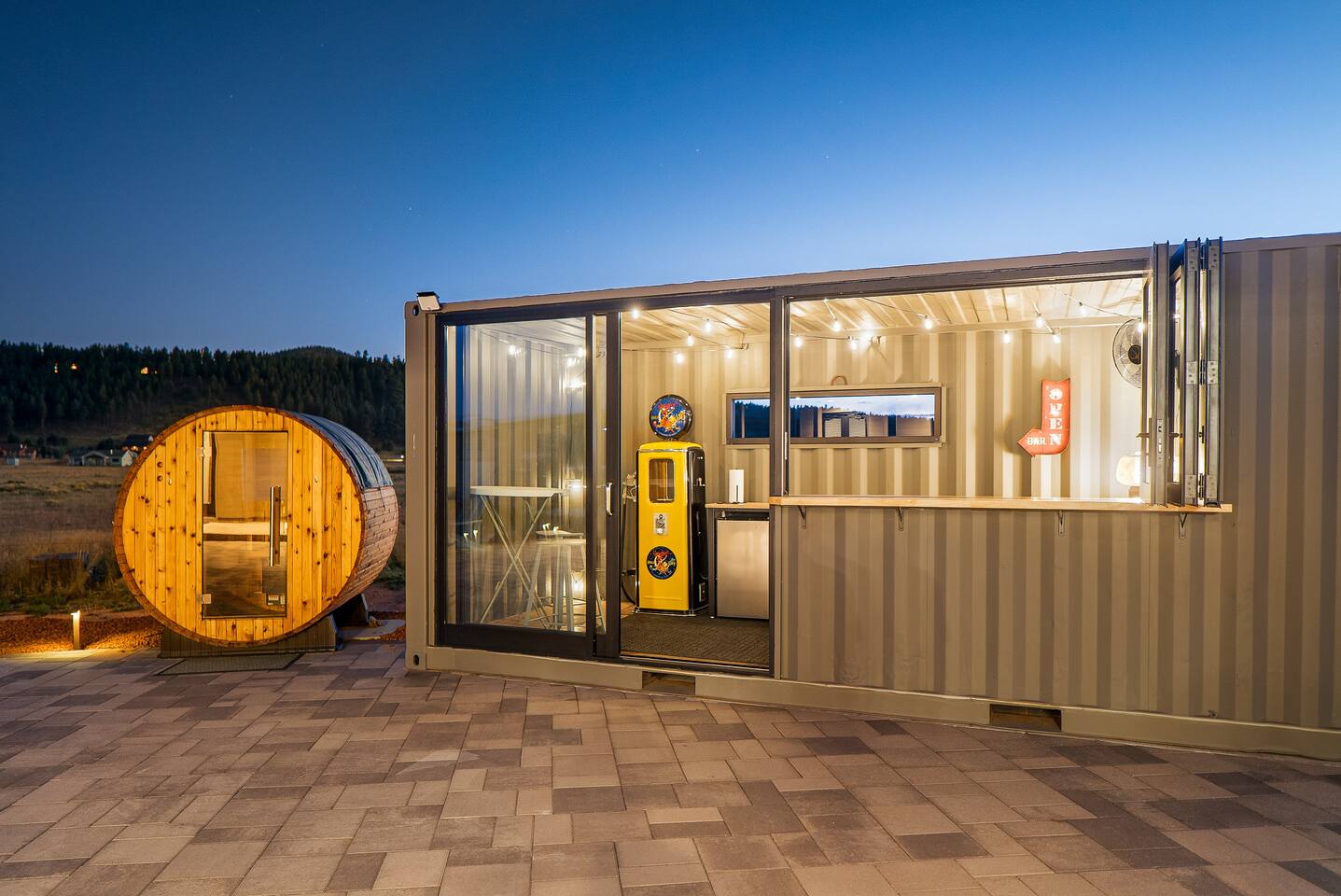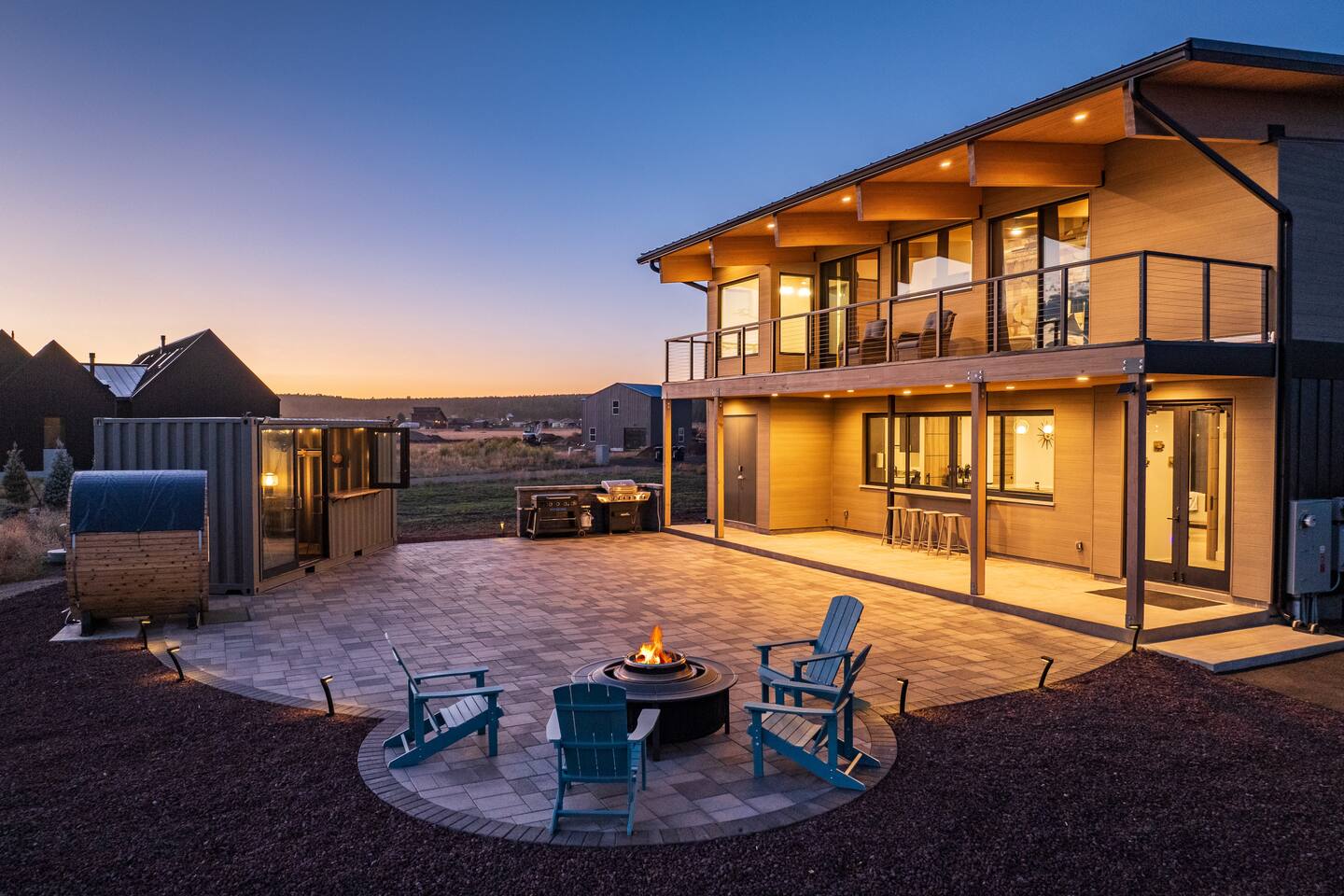 Escape to our modern 3BR mountain retreat on 2 private acres with panoramic San Francisco Peak views! This family-friendly home comfortably sleeps 7 and features a barrel sauna, game room with arcade and shuffleboard, and a unique Connex box bar. Enjoy stunning vistas from 30-ft windows, a chef's kitchen, and starlit decks. Perfect for a memorable getaway with a dedicated workspace and fast Wi-Fi. Available for use is a 220V 50A plug in for EV cars (NEMA 14-50 outlet).